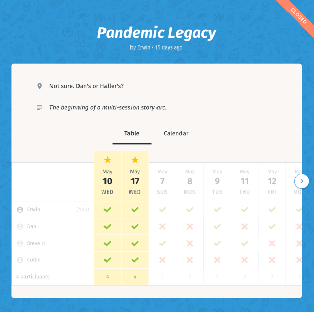 They will (eventually, and with much prodding) enter their names and select the dates they can make it. Once everybody enters their availability, you’ll see on which date(s) the planets align.
