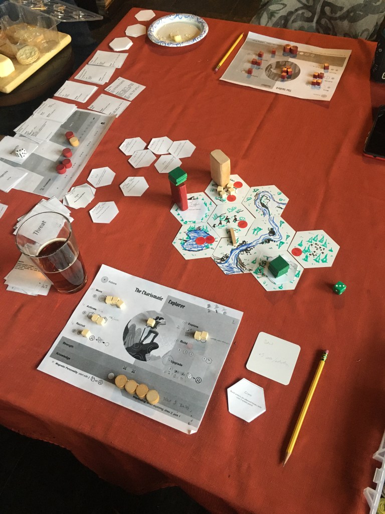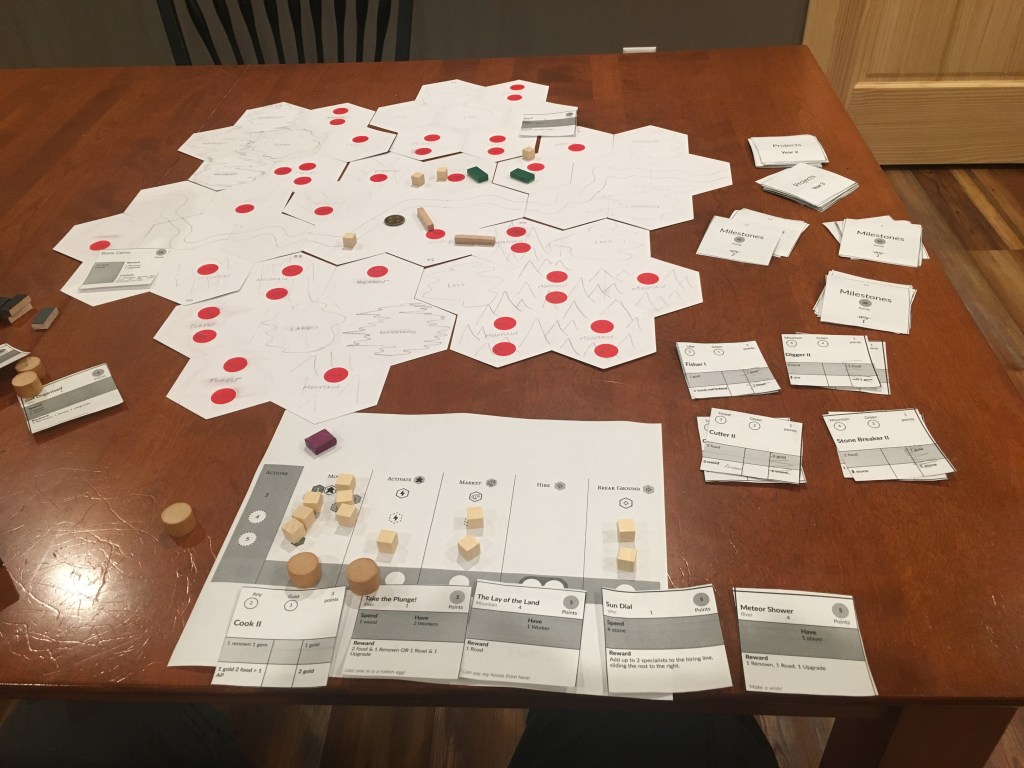 - Meeting #4 was our first playtest to try to see if our core idea, or our core game loop, is fun, at all. Is there anything in here worth pursuing? I’m happy to say that it works great! We had a short page of notes and 2 tasks before our next meeting. I’ll tweak the landscape tiles and Collin will tweak the quest cards and rewards.