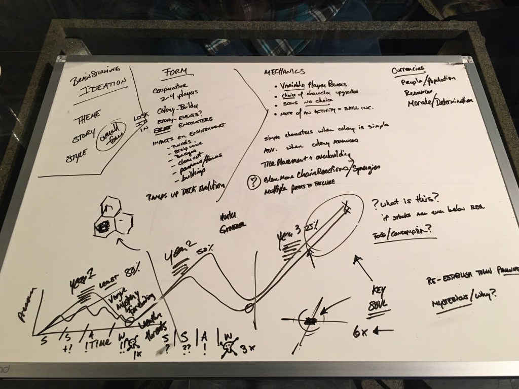 The first step was lots of brainstorming trying to figure out what kind of game we were interested in designing. Most of the first year efforts were spent learning how to work together, how to trust one another with our individual ideas, how to not get hurt feelings, how to give and receive criticism, and how to find clarity on what the hell kind of game we’re trying to make anyway! I don’t think I’m exaggerating when I say 90% of the work effort was just learning how to work well together. Once we got past those relationship hurdles we really hit our stride.