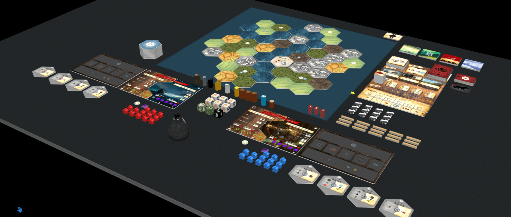 Collin brought some structure to our design sessions, which helped keep us focused. We started using Trello to keep track of discussions around each idea. We met on Monday nights on Discord after my kids went to bed. We had short agendas detailing what we needed to talk about and always left with our own short list of action items to complete before the next meeting. We couldn’t playtest in person, so I learned how to create the game in Tabletop Simulator (and rejected it because running Steam on my computer is too slow), and then Tabletopia. Once we got things in Tabletopia, things sped up quite a bit.